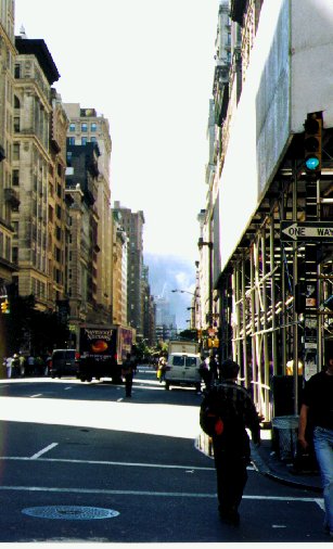 The weather was bright and beautiful, so bright that it woke me up before my alarm. I rolled out of bed and checked my email as usual. Had an email from my friend Mark in Australia- his brother Bradley had an aneurysm and Mark left work and is down with his family. Bradley is stable but we're still worried. Bad start to the day. 1010WINS is an all-news all-the-time station that I listen to in the shower because it gives frequent weather and subway updates. About 9:46am, the regular 1010WINS news was interrupted by a story that a plane had just crashed into the World Trade Center. I jumped out of the shower, dried off, went in the bedroom and turned on NY1. Sure enough, they had live video of the burning tower. My father was flying down to Salt Lake City that morning and also, since he is a pilot, I figured he would want to know about this accident. Plus, he fantasizes about flying up and down the Hudson and East rivers in his plane, taking pictures and admiring the view. Mom answered the phone and told me that my dad had already left for the airport. I told her about the accident thinking it was a little Cessna that had crashed and I told her, "You should get up- this story is definitely worth seeing live." After hanging up the phone, I got on a shirt and pants and continued to watch the coverage and listen to the commentary. One of the witnesses said he saw a twin-engine plane crash into the building and I thought that he must be mistaken. There is no way that that big of a plane would get too close to the tower. Plus, with all the technology, air traffic control and the pilot simply being able to look out the window- I didn't see how it was possible. "It must have been some show-off small plane pilot", I thought. I happen to be looking at the T.V. screen when I saw a plane coming from the right of the screen towards the towers. I thought it must be a firefighting plane. Since I'm from Idaho, I'm used to seeing the tanker planes full of water or flame retardant leaving Boise for the forest fires-- so I was expecting them to drop some retardant upwind from the fire in order to put it out. That's when the second plane struck. Boom! I was shocked, dumbfounded. The plane flew right into the tower and exploded. Instantly, I knew that these two crashes were intentional. Hardly able to pull myself away from the coverage, I ran down to the subway to make an appointment I had uptown. Thankfully, it was uptown, not downtown. I got on the subway and rode uptown without a problem. On my way out of the subway station, there was an announcement that downtown service was suspended. After the appointment I came back and jumped on the first bus going downtown. The streets were filled with people. The bus had to wind its way through everybody the streets were just solid heads and I couldn't tell where everyone was going. The bus was packed but everyone was talking as a group. The girl next to me said that the towers had collapsed. "What?” I said, "They collapsed? What do you mean?” She said they both had fallen down. I was stunned. One woman had a small radio and headphones and as she heard news, she would share it with the bus. Everyone would discuss that issue until the next bit of news. She told us the subways were all stopped. She told us about the Pentagon burning. This got everyone scared and one woman started crying. Then she told us that all bridges and tunnels going in and out of Manhattan (it's an island) were closed. Everyone was playing with his or her phone, trying to get a call to go through. The lines had been clogged all morning, plus some companies had antennas on the roof of WTC building 1, which affected long distance service. I too was constantly pressing TALK then END then TALK- suddenly I got a line and was connected to my mom back in Boise. She had gotten up and was now, along with my sister and Dad, trying to call NYC to see how I was. Now that I had a connection to the news, my Mom related events to me, which I then shared with everyone on the bus. The first thing I found out was that a plane had also been crashed into the Pentagon and that was why it was burning. I knew now that this was a big, planned, sophisticated attack. Mom told me now that all U.S. airspace had been shut down and all planes in the sky were told to land immediately and the ones on the ground had to stay. I shared that with the bus and one woman said, "Don't lose that phone line. You won't get connected again." I stayed on about an hour, till I got home. Another woman said her sister was a cop and was working below the towers when they collapsed. She had been unable to reach her on her mobile phone and so the sister was worried. The last bit of info I passed on was that all overseas flights had been diverted to Canada. The closing down of the air space really hit home for me that this was a war. The bus was going down Broadway and there was one obstacle between it and my apartment- the Empire State Building. I did not want to walk anywhere near the building so I went a few blocks past my street and starting walking on a wide berth around the building and back to my apartment.
