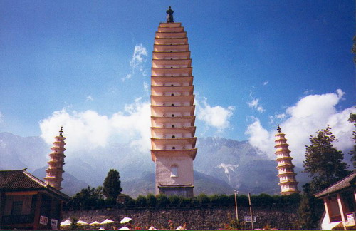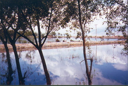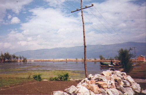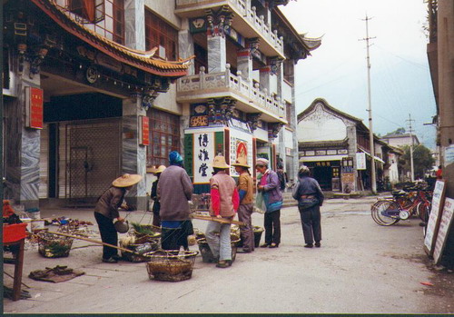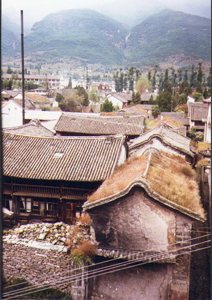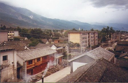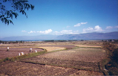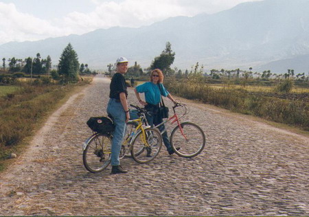 herb tea & talked we’re having a great time. This is not like November 5th 1993 We are sitting in Jims Peace café & are listening to Shubidua (a Danish pop group) & their “Står på en Alpetop” (Standing on an Alp top”) somebody left a tape – could be a guy we have heard so much about lately Carsten is his name – he’s from somewhere in Denmark – we have ordered a Muslim pizza & is drinking Dali beer while we wait. We took a long walk today – down to the pretty lake Erhai – we took a lot of photos of it & the houses we passed & the town when we got back. The lake is east of town & the mountains are west of it. We can see the rain & fog over the mountaintops – but it seldom rains down here. November 6th 1993 We’re so soar. To day we rented bikes & headed north out of town. (40