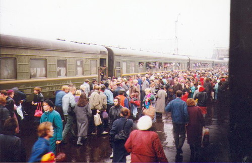 Russia - Trans Siberian Railway 9/1993 September 9th 1993 Boarded the train – said goodbye to In Stockholm we had to ask 2 policemen for the direction to Silja Line – they suggested that we took a taxi & we did. The ferry is big – like a floating mall. WOW! But being backpackers we were shown down to our cabins on deck 2 (we entered the ferry at deck 7) – down here under the waterline – it’s party zone. Our cabin is smaller than small – we took a walk around the ship & found a bar with cheap beers. Now we’ll try to sleep. October 10th 1993 Arrived in Finland at the ferry terminal – when we finally got out of the ship the train had left – met 2 other “toolaters” Mette & Frederik (from Vejle) together we found a bus to Turku – the bus driver explained how we catch a train in Turku & easily catch the train in Helsinki. Mette & Frederik are also going on the Trans Siberian Railroad. We already have some friends now. Later – Trees – rocks - wooden houses & rain – this is what October 11th 1993 Woke up stiff & sore – the Russian everyday life rolled away outside the windows. Birch trees & old worn down wooden houses. It looked so sad. Packed our belongings & had breakfast & sad down & “inhaled” the suburbs of Moscow rolling by. Our guide Tania waited at the central station for us – Mette & I decided it looked like a movie from the 30’s – under the great depression – we entered a bus & it took us to hotel Belgrad 1 – number 2 is on the other side of the street. Annemette & I got a huge room with shower – I had a very needed hair wash. And then we met up with the rest of the “clan” - we ate breakfast & then we had a tour through Moscow – Stopped outside Kremlin & saw the Red Square or Krasnaya Ploschad as its real name is – it really meant the beautiful square – outside the pretty St. Basil Cathedral I gave a beggar 1$ - she almost wouldn’t let go of my hand. Then we drove up to the Moscow University – from where we could see all over town – bought some souvenir t-shirts & was taken back to the hotel. Had a real shower & met the Danes & took a walk up the Arbat street – found a $$ store – but went out again – wanted to buy a beer in a café – but they didn’t serve for tourists – so we found a local beer & champagne shop & brought some bottles back to the hotel. Had a small room party – with all the girls. Annemette & Sussi went down to the bar – I sorted clothes to leave for the caretakers - little old worn out ladies – who make sure you get towels & soaps – now I’ll sleep. October 12th 1993 Woke up early – Annemette had a shower & packed her stuff – then I had a shower – my last one for the next week or so. We left our left over clothes on a shelf in the wardrobe (we brought the scarves - gloves & shawls along to give away in an extra bag) then we went down to eat breakfast & met 2 newcomers Morten & Dan (from Høng) – they were going on the Trans Siberian too but flew to Moscow. After eating we went on a bus tour to a museum & saw wonderful paintings – then Tania took us through the metro – that metro station we came down to was super fancy – with beautiful mosaic tiles – (like paintings) in the ceiling. We met some other Danish travelers – a whole family (from Holme Olstrup). We bought postcards & stamps & send the whole lot from a small post office – Back at the hotel the caretakers had collected our left behind stuff in plastic bags & it took a while trying to explain that we didn’t wanted the things – it was for them to keep. They were almost in tears – Tina – Sussi & Mona wished they had brought something to leave behind too. Then we said goodbye to Tania & was transported down to the train wagon 13 – 29 – 34. Annemette & I share compartment with Tina & Sussi. Dan & Morten lives next door – together with 2 Chinese guys. The toilet is out between the wagons & it does NOT smell of roses – though we tried to wash the floors with Silja Line shampoo & spray it with Annemettes deodorant. We got a samovar with boiling water outside the toilet door We just had a small get together party in our compartment – with Vodka & Chinese beer – rolling through the Russian night. October 13th 1993 We stopped at a train station 30 min ago & on the other side of the platform a Chinese train pulled in. The whole - very empty train station - came alive – The Chinese in the train sold their goods out of the windows & the Russians outside bought & traded & jumped & crawled around trying to get the best bargain – it was hysterical funny to watch. We tried to make our compartment home alike – glued “Gocards” up on the