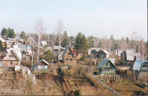 walls (Gocards are free postcards you can get in cafes in The toilet is still something else – the Chinese are use to “eastern style” toilets & they stand up on the toilet seats while peeing – this is a real bumpy train ride so most of the urine ends at the floor – we joke & say – “well!!! I’ll get my Wellingtons & go to the toilet”!!!! (these boots would have been handy). Endless brown fields – woods & telegraph poles rush away outside the windows. They (the windows) are not tight – so the wind & coldness crawls in. The food is “enjoyed” in wagon 4 – (tomato salad - rye bread & some terrible grease soup.) I buy kefir at the stations from little old women in thick over coats. We also buy vodka – it’s good for everything. October 14th 1993 Somewhere east of Omsk. We met our Chinese neighbors – a very tall girl & her tiny little husband. I gave her a “topsy tail” thing for her long hair – they both said I was pretty (did you hear that???) – we’d been down on a platform to buy bread while we had a 7 min. stop – somewhere. The view had change now – endless plains – birch trees & cute little towns – with wooden houses painted in bright colors – life hasn’t changed out here. October 15th 1993 Yesterday we stopped in Novosibirsk - & we all got down on the platform & jumped