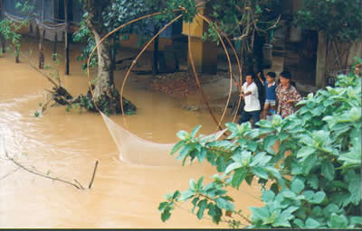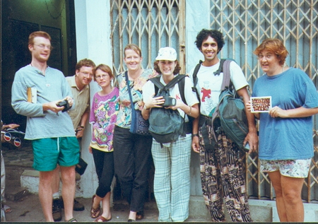 Oct. 27. Woke up at 05:30 & ran down to say goodbye to Johnny & Lisa who were going to Hong Kong & Heather who were flying down to Bangkok. Johnny gave me his worn but useful L.P. Vietnam book (it's ragged Johnny but I still got it!) Perry came just in time for the last best friend photo - Then we all went separate ways for a while. Well David - Annemette & I went down to buy train tickets for Hue - for some strange reason we ended up with tickets for 2 different trains going south that night.(Only 30 min. After each other!) Then Annemette & I went over to the GPO to send the last letters & pick up the last poste restante letters for all of us. We ate some tomato soup on the way back - said goodbye to the owners of Queens guesthouse & went home to the hotel to pack. Met David in his room & walked down to the station. After a goodbye beer - we entered our train wagon & this is where we are now - I'm in the top bed (we're traveling soft sleeper) there are 65cm.from bed to ceiling - I can't even sit up! & I got 12 hours ahead of me! Oct 28. 12 hours!!!!!! What a joke - here we are somewhere north of Hue - the tracks are flooded - we're at a hilltop - & there is water everywhere around us! Wonder where David is (he was at a small train station where he could buy food ). We haven't had anything to eat & are starving!!!!!! Our fellow travelers must have noticed the hungry way we looked at the chickens running around outside the train - because one of them said something to the train conductor & he waved at us to follow him down in the staff wagon. Here they told us to sit down - they giggled & gave us chopsticks & placed a lot of food on the table. Then they all sat down to stare at us. Cool! ;P But we didn't have any problems eating with chopsticks & they all applaud when we finished the meal - then they giggled some more & placed a jar full of water & tiny little super hot chilies in front of us! "Dig in" we whispered to each other. I "fished " a couple of chilies up pretended to chew them & swallowed them whole. So did Annemette though I think she chewed the first & yes it was HOT. We were accepted & only had to pay ½ the price of the food. The train trip finally ended after 24 hours in rainy Hue. We started to walk up le Loi street - a girl on a motorbike followed us. "Where are you going???" - "to hotel Morin!" - "it's not there anymore" she said & she was right! Well - we were going to meet Perry there (he was flying down) & David coming in the next train. We agreed to follow her to her family hotel if she would take us back to David's train - which she of course accepted.(more guests) & so it went - the hotel Thanh Thuy is placed in a narrow side alley - right across to a wonderful vegi-restaurant . David didn't mind it either. Tomorrow we'll try to look for Perry. |